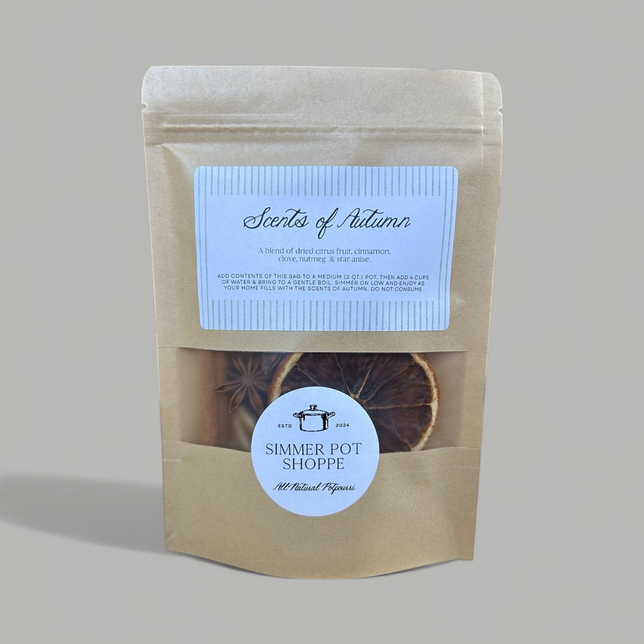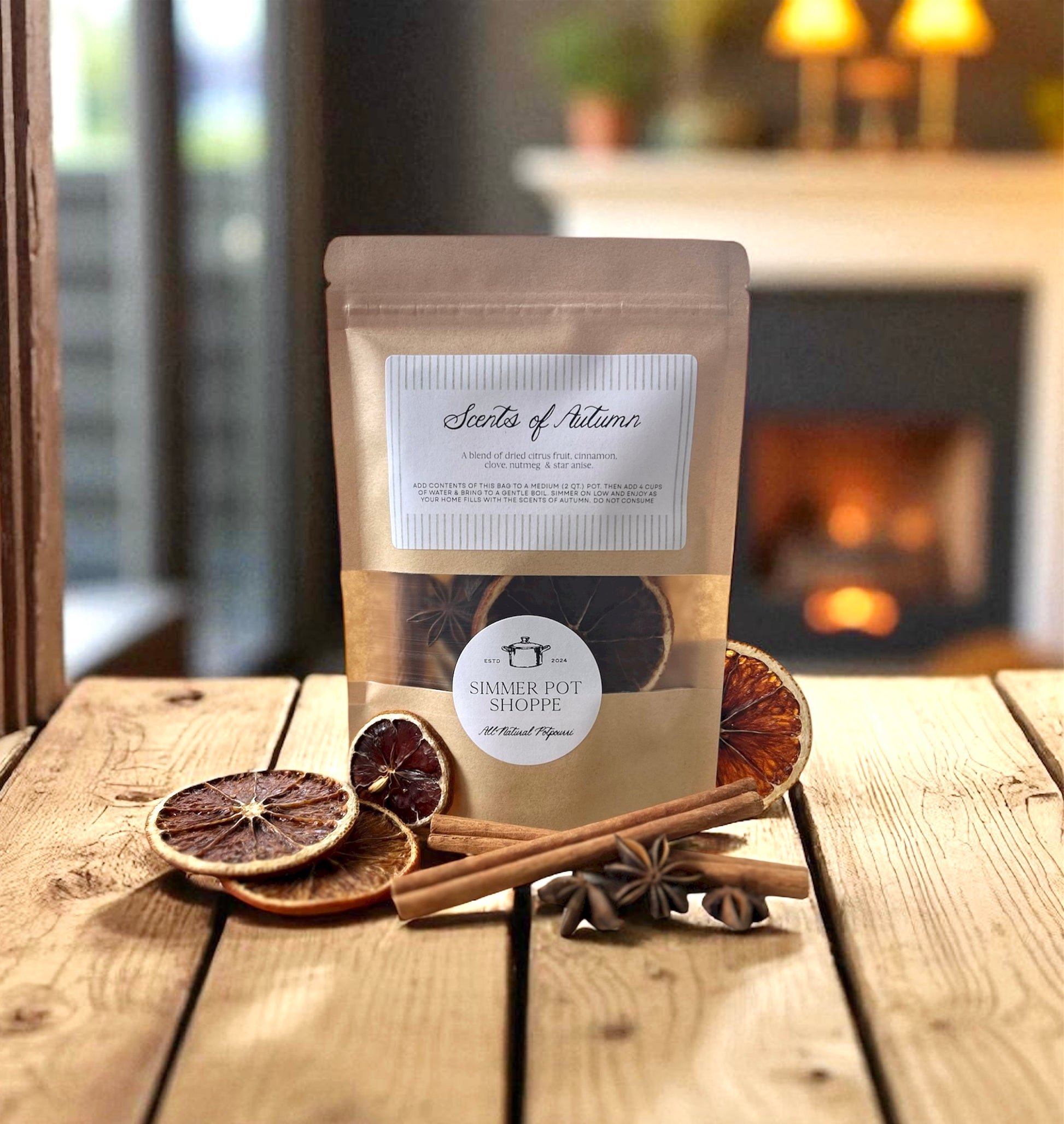 Bring the cozy feeling of fall into your home with this all-natural simmer blend. Handcrafted with dried citrus fruit, cinnamon, clove, nutmeg, and star anise, it creates a warm and inviting scent that captures the essence of the season—comforting, nostalgic, and completely natural.